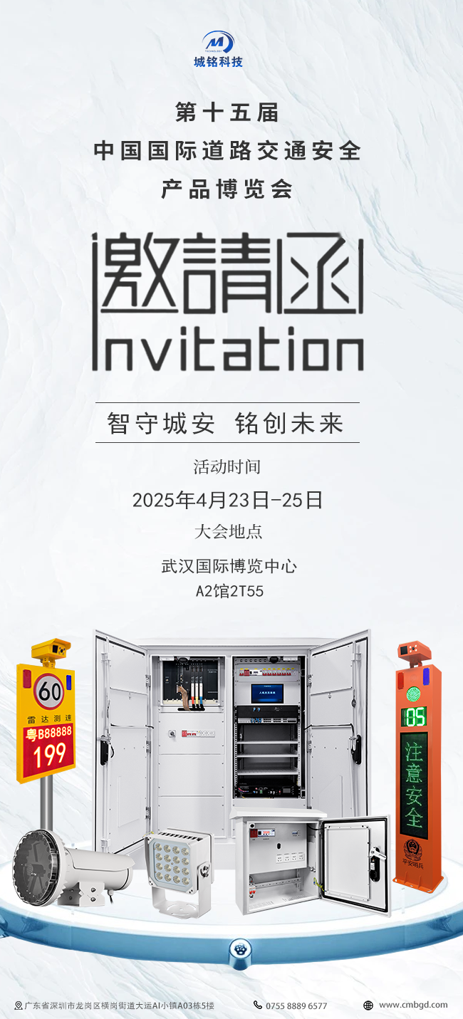 深圳市城銘科技有限公司誠邀您參加2025第十五屆中國國際道路交通安全產品博覽會,本屆交博會以“新科技新交通 新業態新發展”為主題,集產品展示、商貿洽談、技術交流、科普宣傳等活動于一體,致力于打造道路交通安全科技推廣應用平臺,積極助力道路交通安全行業高質量發展。